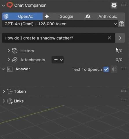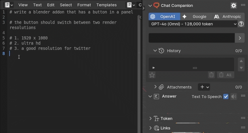 Conveniently use large language models in Blender! Be more efficient, get help, code and listen to the answers with text-to-speech.